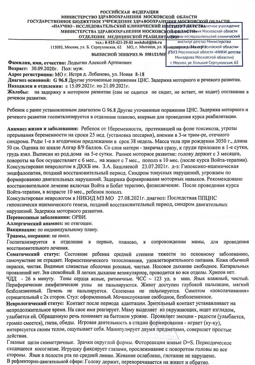 Алексей родился в срок, вовремя стал держать голову. После 6 месяцев мы заметили задержку моторного развития. Леша не сел и не пополз в нужный срок. Диагноз ДЦП поставили после года, когда уже стало понятно, что он сильно отстает в моторном и психическом развитии. У Леши наблюдалась сильная спастика.