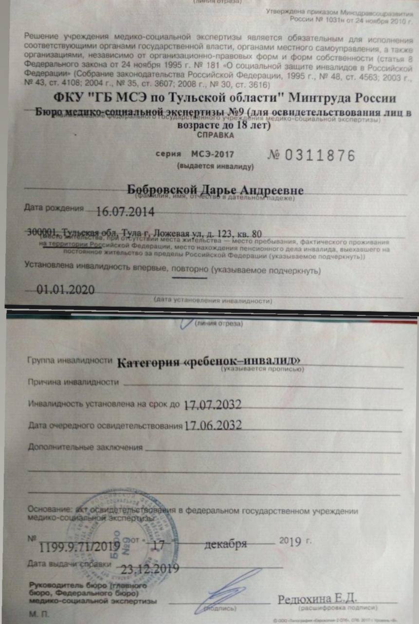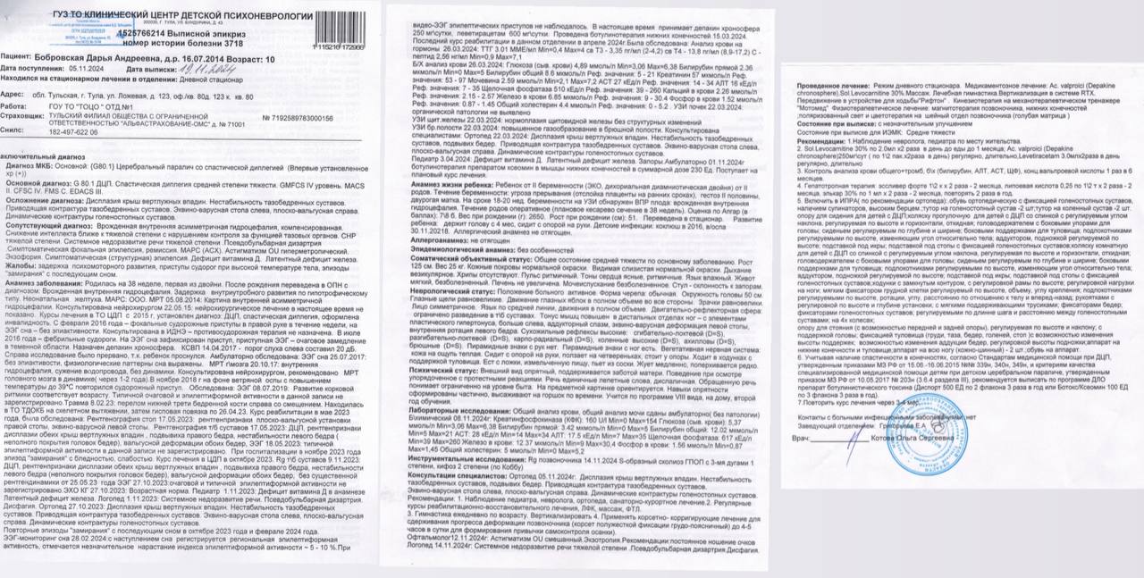 Добрый день☀️, меня зовут Людмила. Живу в городе Тула. Я мама троих детей🤍. Старший сын Никита учиться в институте и две девочки близняшки 10 лет Маша и Даша🎀. Это были долгожданные дочки, к рождению которых мы готовились всей семьёй. Беда пришла после рождения😩, обе девочки оказались не здоровы Маше был поставлен диагноз апплозия малой берцовой кости правой нижней конечности😢. С 2 мсесячного возраста мы наблюдаемая в Санкт-Петербурге в институте им. Альбрехта. Маша перенесла уже 5 операций на ноге, последняя была самая тяжёлая пол года она ходила с аппаратом Илизарова, и сейчас нога восстанавливается очень тяжело. Но Маша не сдается, она отлично учиться в 4 классе, плавает, занимаеться танцами, несмотря на разницу ног в 4 см. Мы постоянно стараемся посещать реабилитационный центры, что бы пр максимуму восстановить ногу. В этом году у нам была ещё одна сложная операция, удленяли ногу аппаратом Илизарова. Восстановление было тяжелое. Много сил и соедств ушло на послеоперационную реабилитацию. С Дашей все оказалось намного сложнее, с рождения мы поняли что Даша развиваться с задержкой, в 1 год нам поставили неутешительный диагноз ДЦП спастическая диплегия. Даша не ходит, практически не разговаривает, но несмотря на это она очень добрая и светлая девочка, мы называем ее наш ангелочек. С постановки Даши диагноза началась наша бесконечная работа. Мы перепробовал много реабилитационный центров и в Москве и в Санкт Петербурге. Что то было зря, а что то дало не плохие результаты. Но разрыдаться между городами имея большую семью просто нереально. В одном из разговоров мамой такого же ребёнка нам посоветовали центр Логос в нашем городе и мы конечно же не упустили эту возможность. Последние пять лет мы посещаем центр Логос в г. Тула. Нам нужны занятия ср специалистом по АФК, обязательно массаж, занятия с логопеда, бобот, занятия в костюме Адель. Каждцю неделю занятия с деффиктологом. У Даши есть положительная динамика, огромное срасибо за это специалистам центра. Так как у Даши проблемы с тазобедренным суставом (нестабильность) наш реабилитолог посоветовал нам ипотерапию. Даше очень нравиться общение с лошадьми, она получает положительный заряд эмоций, и конечно же это очень стабилизирует работу всего организма. Это очень маленькие, но очень дорогие для нас победы. Мы посещаем центр раз в три месяца, но этого мало, для лучшего результата занятия нужны регулярно. В феврале прошлого года при неудачном радении на реабилитаци Даша сломала ногу, перелом и восстановление были очень тяжелыми, теперь нам приходиться заниматься с удвоенной силой. Но мы не сдаемся!!! В семье где два ребенка инвалида и работает только папа это практически невозможно. Все средства уходят на реабилитацию девочек. Нам очень нужна материальная помощь для реабилитации Даши в центре Логос. С огромной благодарностью и надеждой на поддержку семья Бобровских.