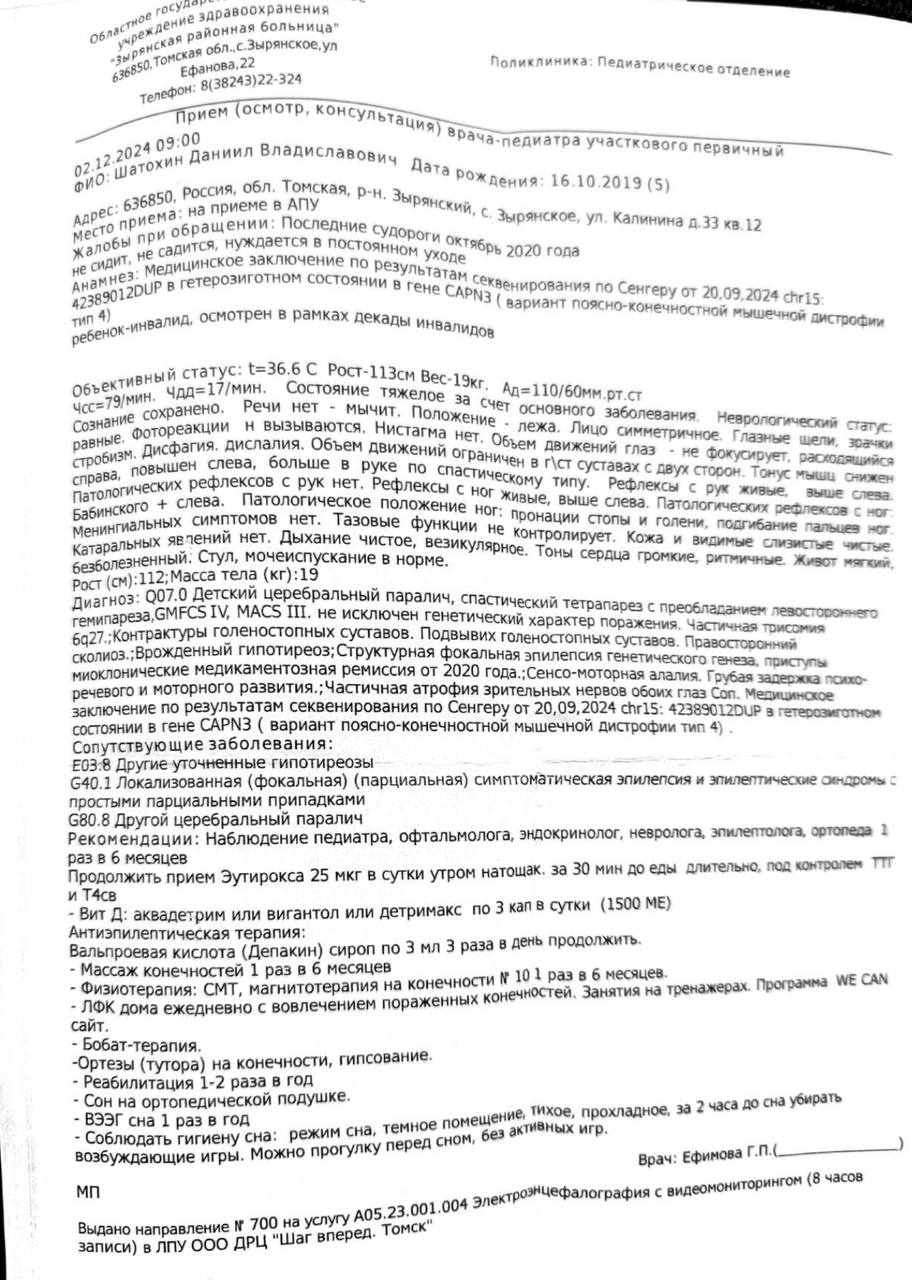 Даниил родился на сроке 40,4 недель🥺. Беременность моя протекала хорошо👌. На сроке 20,6 недель на УЗИ плода, поставили под вопросом: агенезия полости прозрачной перегородки, частичная агенезия мозолистого тела😭💔. На следующий день мне сделали кордоцентез, затем пришел результат 46XY❤️🩹, что означало, что никаких хромосомных патологий у ребенка нет🙏. Родился мой сыночек абсолютно здоровым ребенком, 8/9 Апгар. В первые сутки упал сахар, с показателем 1,3 ммоль/л ребенка перевели в патологию новорожденных и недоношенных детей с диагнозом гипогликемия☹️, где он провел 6 суток. В возрасте 14 суток жизни при контрольном исследовании НСГ выявлена дилатация правого бокового желудочка. Сыночку сделали МРТ ГМ, выявили врождённую аномалию ГМ- синдром Арнольда-Киари 1 типа. В возрасте 18 суток жизни, нас выписали домой.Когда ребёнку было 3 месяца, мы ездили на консультацию к генетику, по поводу врождённой аномалии Арнольда-Киари, у сына брали генетический анализ. И спустя год пришёл результат, что у ребёнка частичная трисомия 6q27, Даня 4-ый человек с данным диагнозом на конец 2020 года. Трисомия очень редкая, к сожалению мы совсем ничего о ней не знаем, поэтому мы сами создатели прогноза на будущую жизнь. Так же сдавали полногеномное секвенирование и секвенирование по Сэнгеру, выявили поясно-конечностную мышечную дистрофию (кальпаинопатия). Врождённая аномалия ГМ синдром Арнольда-Киари, он оказался ошибочным и данный диагноз Дане "сняли". Но именно из-за чьей-то ошибки, мы узнали, что наш сын имеет генетические мутации.Сам по себе Даня спокойный и жизнерадостный, очень любит слушать музыку и сказки.Так же помимо генетических диагнозов, у Дани ещё ДЦП, ЧАЗН, эпилепсия, гипотиреоз, искривление позвоночника 3 степени.Реабилитацию мы проходим в ДРЦ "Шаг вперёд" и результатом мы очень довольны. Благодаря реабилитациям Даня многому научился, в том числе и недолго стоять. Я считаю, что это отличный результат.Я верю, что мы со всем справимся и у нашего Данечки начнется счастливая полноценная жизнь.