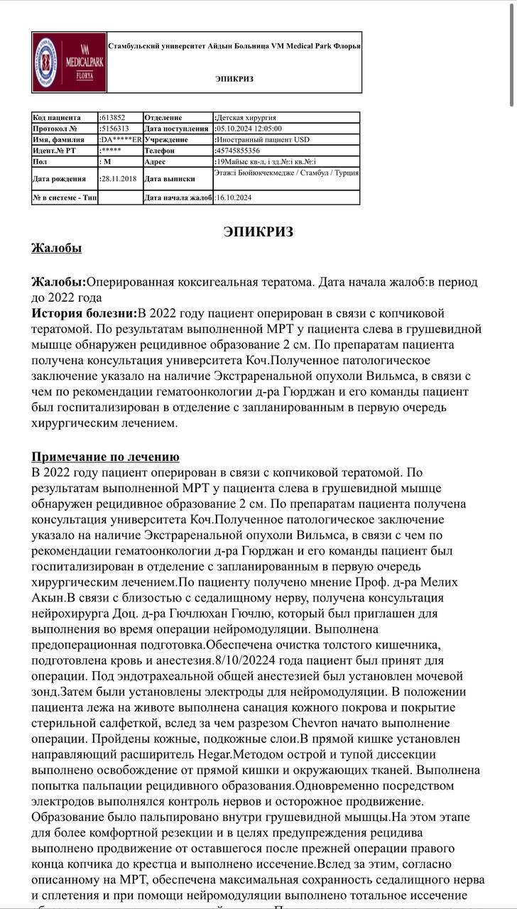 Когда мы обратились к онкохирургу, нам сказали, что нужна срочная госпитализация, но повторная операция может быть ОПАСНОЙ! ⚠️ Мы не могли сидеть сложа руки и решили получить второе мнение — в Турции, в клинике Medikal Park! Там мы сдали биоматериал опухоли, и результаты шокировали нас! 😱 Нам поставили новый диагноз: опухоль Вильмса — опухоль почек! 💔 Но это был еще не конец!