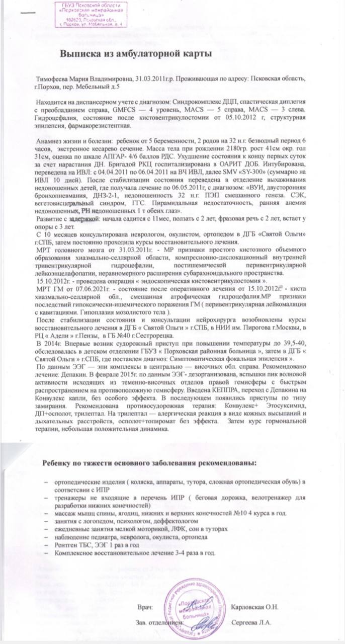 Мы с мужем делаем всё, что в наших силах, чтобы облегчить её страдания, но для того, чтобы она могла ходить, развиваться, стать здоровой и счастливой девочкой, ей необходимо пройти дорогостоящее лечение и реабилитацию. Это лечение — её единственная надежда на лучшее будущее, на возможность стать самостоятельной и радоваться жизни. Но эта помощь стоит 1 000 000 рублей — такую сумму мы не можем собрать сами. 😞
