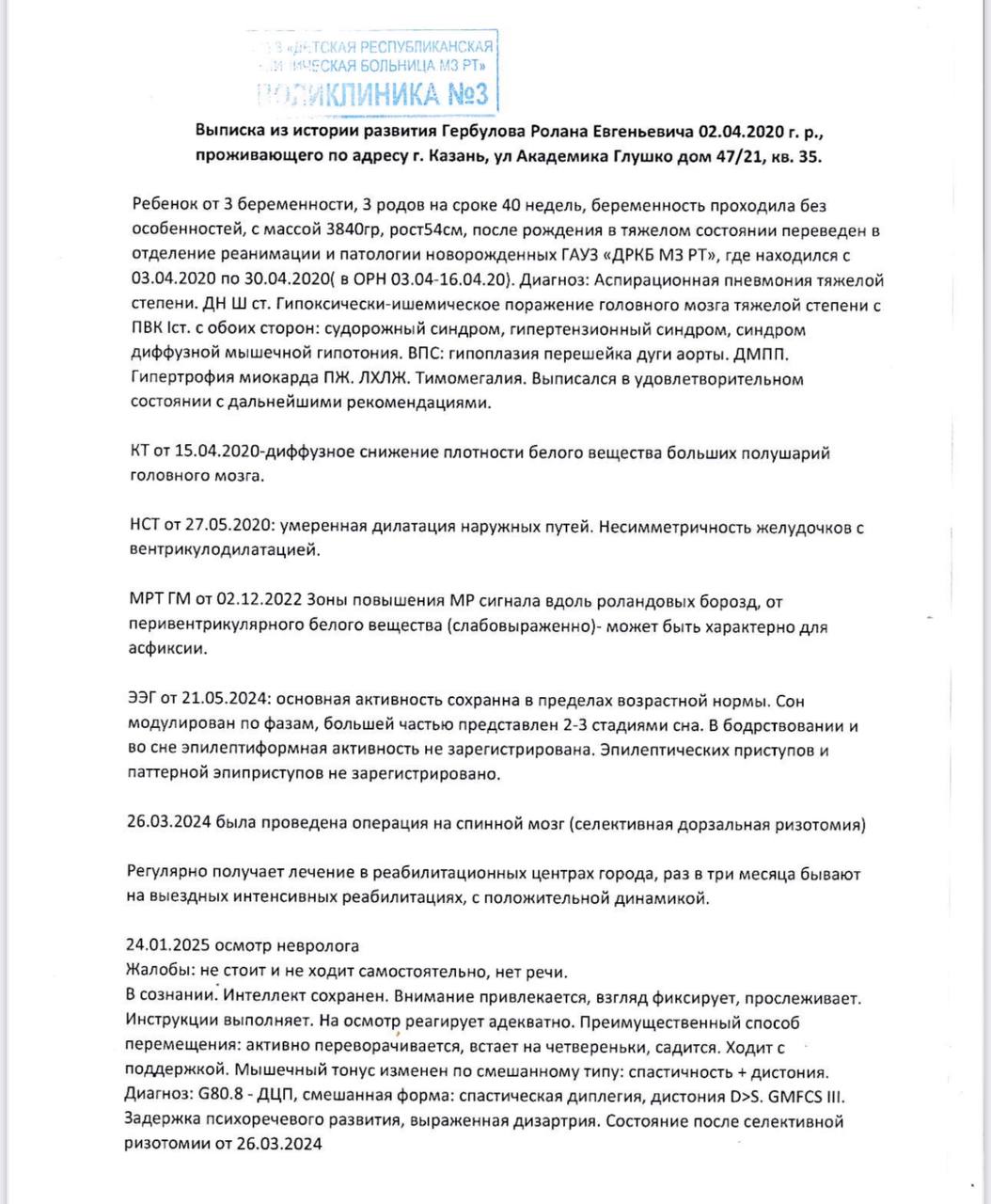 26 марта 2024 года Ролану была проведена очень важная операция — селективная дорсальная ризотомия (СДР) в НИКИ Вельтищева у нейрохирурга Зиненко Д.Ю., целью которой является устранение спастичности. 🏥