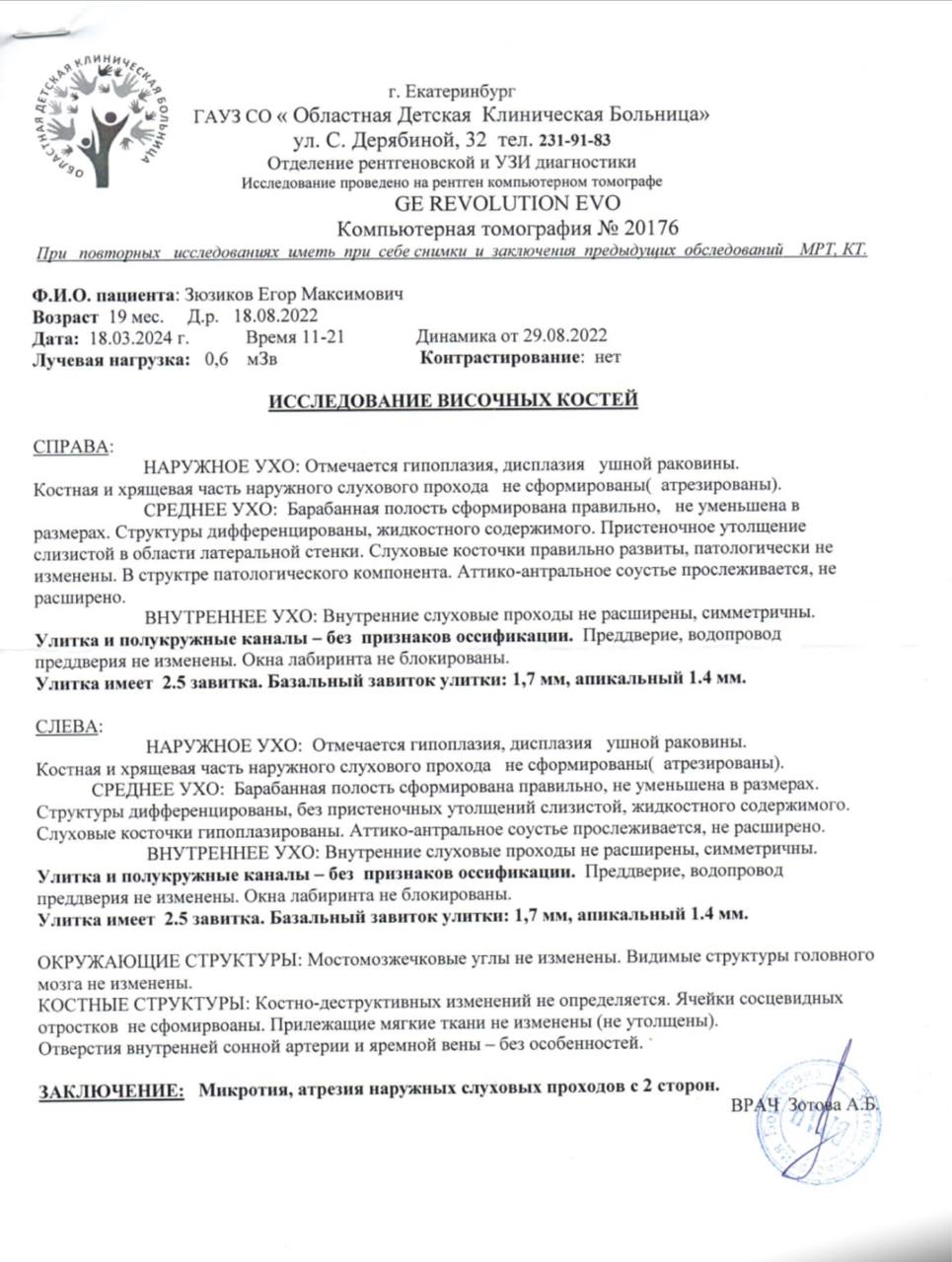 Все аудиограммы и КТ отправили в единственную в мире Американскую клинику California Ear Institute, где опыт работы с данной патологией более 30 лет. Мы были обрадованы всемирным отологом, доктором Джозефом Роберсоном, который сообщил, что Егор является кандидатом на восстановление слуха с двух сторон. 🌍👂