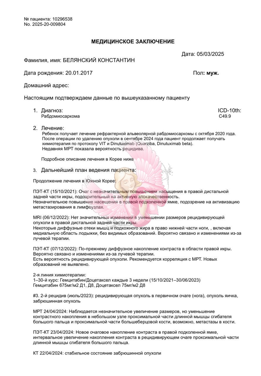 Сейчас он снова в онкологическом отделении. Лечение продолжается, но клиника выставила новый счёт — 3 799 900 рублей.