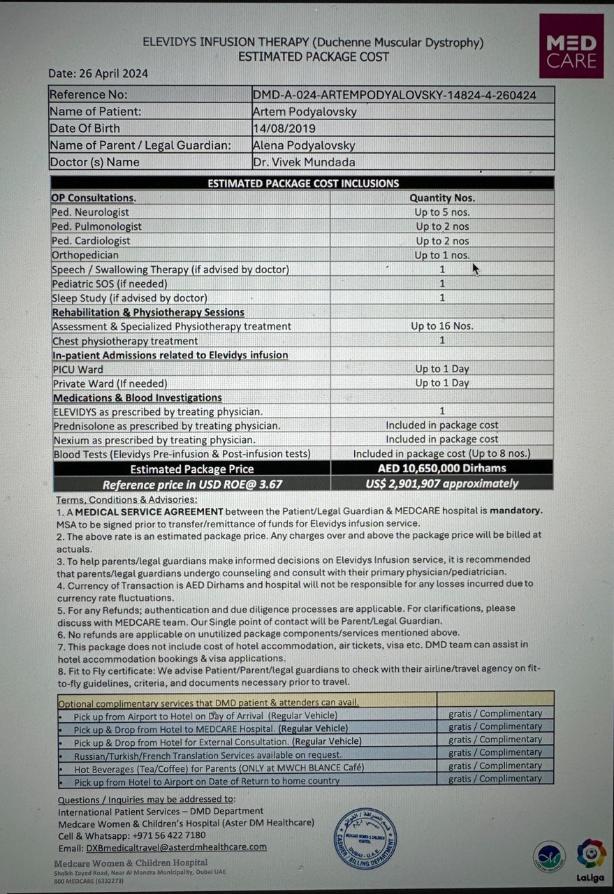 ТРЕБУЕТСЯ препарат ELEVIDYS Medicare Women & Children Hospital Dubai UAE