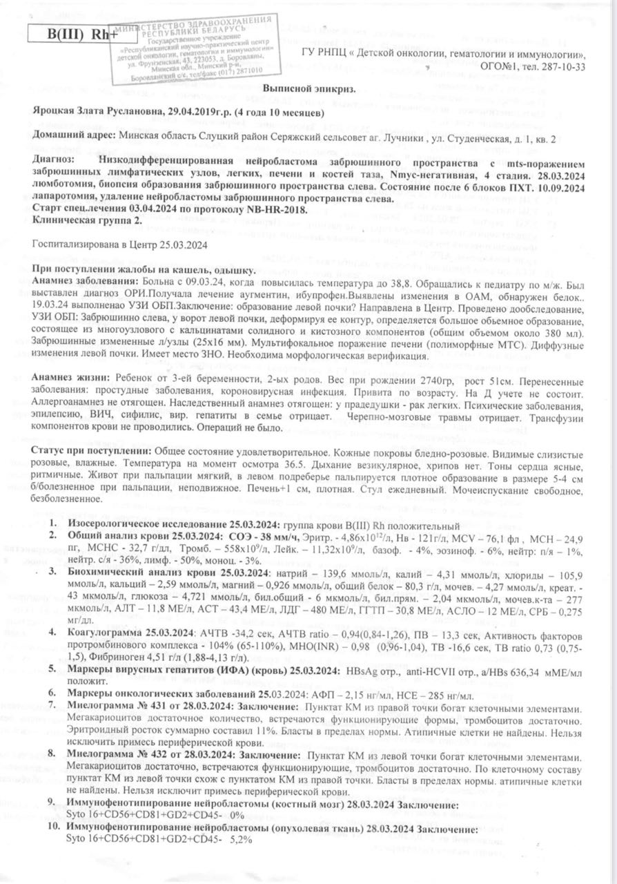 🙏🏻Нашей семье уже 10 лет. С самого начала своих отношений мы мечтали о большой дружной семье, детях и собственном доме❣️. Через 2 года после свадьбы родился сын Дамир🩵. Роды проходили очень сложно, у мальчика диагностировали острую гипоксию.Именно это стало причиной его проблем со здоровьем. У Дамира аутизм и третья степень утраты здоровья. Злата появилась на свет в 2019 году. Абсолютно здоровая девочка, «золотце наше». Она росла обычным ребенком. Ходила в сад, обожала рисовать, лепить, как истинная маленькая леди - делать макияж и прически! Наша счастливая жизнь с беззаботным детством изменилась весной 2024 года: 11 марта доченька заболела, у Златы поднялась высокая температура, мы ничего не заподозрили. Температура и температура.Все же на дворе сезон простуд. Мы обратились к врачу. Анализы, антибиотики - доктор лечил у ребенка обычную простуду. При этом анализы оказались плохие — высокая СОЭ и белок в моче. Никто не понимал в чем причина, почему ни противовирусные препараты. ни антибиотики не действуют. Через неделю Злате сделали УЗИ брюшной полости.Именно тогда наш мир рухнул. В заключении врача значилось подозрение на нейробластому со множественными метастазами в печени! 25 марта 2024 года нас срочно госпитализировали в РНПЦ ДОГИ. Провели ряд обследований: анализы, КТ, КТА, МРТ.УЗИ, биобсию опухоли, пункцию костного мозга... Назначена химия терапия по программе NB-HR-2018 и МЙБГ гамма - сцинтиграфия в Питере. Как сейчас помню свою беспомощность и панику, а самое страшное - больные, измученные глаза своего ребенка.Принять болезнь своего ребёнка не возможно, но от нас зависит настроение Златы и желание бороться. Злата терпеливо проходит лечение и верит в скорейшее выздоровление.Мечтает увидеть этот мир без боли и страха. После 5 блока ребену провели операцию по удалению опухоли, операция прошла успешно. Затем сцинтиграфия в Питере. В данный момент рядом с дочкой папа, заканчивают 6 блок химии. Для Златы и для всей семьи папа особенный человек: опора, защита и любовь. У нашей девочки хорошая положительная динамика. Благо мы живем в Беларуси и лечение бесплатное. Но к сожалению, этого недостаточно. Нейробластома очень коварна и в большинстве случаев склона возвращаться. Что бы увеличить шанс на безрецидивную жизнь, по результатам консилиума, учитывая группу высокого риска, Злате показана иммунотерапия препаратомDinutuximab beta, который не зарегистрирован в нашей стране и стоимость которого