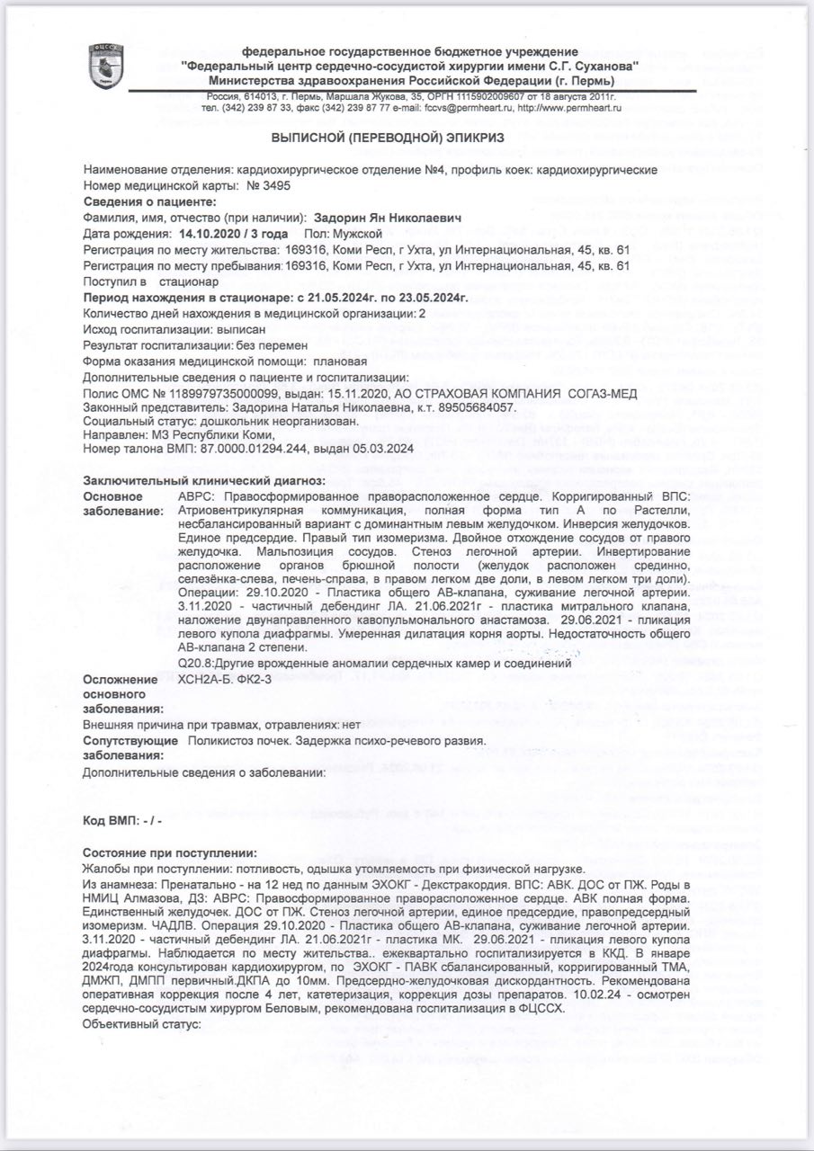 <p>Здравствуйте. Новости Яна Задорина Здравствуйте, уважаемые благотворители. На прошлой неделе сходили с Яником на узи почек. Напомню, что при рождении сыночку поставили поликистоз почек взрослого типа. У папы, бабушки и прабабушки Яника был такой же диагноз. Но, к счастью, в обоих почках в этот раз кист не обнаружено, хотя почки всё ещё немного увеличены в размерах. Может это особенность организма или уже знак, что нужно срочно лечить сердечко😔 Будем и дальше отслеживать динамику и надеяться, что хоть этот диагноз у нас снимут🙏 На днях посетили выставку техники ПАО "Газпром". Яник был в восторге - посидел в кабине бульдозера, в вахтовке, послушал рассказ в машине связи и многое другое. Даже не хотел уходить! В садик сынок ходит с радостью. Летом занятий не проводят, период отпусков у специалистов. Поэтому дети больше гуляют, рисуют, лепят. Но радости даются тяжело... Даже подъём на один лестничный пролёт вызывает одышку, синеют ручки и личико, а сатурация снижается до критических 79%😔 У Яника за плечами уже три операции на сердце и впереди ещё одна - самая важная. Но медлить нельзя! Чем дольше откладывать, тем выше риск😔 Я прошу, помогите быстрее закрыть сбор и подарите шанс моему мальчику🙏 Мы благодарны каждому, кто не проходит мимо! С уважением, мама Яника.</p>