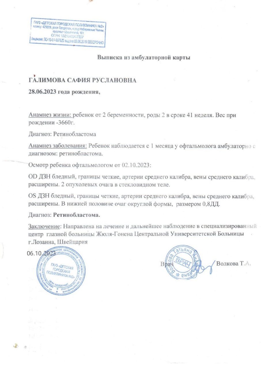 Я Галимов Руслан Салтанович, Хотел бы обратиться к вам за помощью. 28 июня 2023 года в нашей семье произошло чудо. У нас появилась на свет великолепная девочка Сафия, но спустя три месяца выяснилось, что у нее тяжелое заболевание рак сетчатки глаз (Ретинобластома). После её рождения мы проводили обследования, чтобы подстраховаться, так как у нас очень большой риск наследственной ретинобластомы. все обследования показали, что все чисто. Буквально вчера 2 октября мы самостоятельно решили пройти ретинарную камеру в Г. Казань и, обследование показало, что у нас два очага в одном глазике и один во втором. Данное заболевание очень быстро прогрессирует и могут быть метостазы в другие органы и ткани. Мы изучили методы лечения и опыт клиник мира и выяснили, что успешно такое заболевание лечится в клинике США (Memorial Sloan Kettering Cancer Center) и Швейцарии (Hopital ophtalmique Jules-Gonin). У них очень большой опыт в лечении данного недуга и этому есть множество подтверждений других семей , которые столкнулись с аналогичной проблемой. Из-за ситуации в мире в клинику США мы попасть не можем, но за то мы можем попасть в клинику В Швейцарии, где нас уже ждут 13 октября. Клиника выставила нам счет в размере 65000 Франков, что равно примерно 6600000 - 6800000 в зависимости от курса ЦБ. потом. Для нашей семьи это просто неподъемная сумма и я сердечно прошу вас о помощи. Помогите пожалуйста нам собрать эту сумму для спасения жизни и зрения нашего маленького цветочка Сафии. Я сам такую сумму не смогу заработать, мне жизни не хватит, к тому же я инвалид по зрению. Я имею медицинское образование и работаю массажистом. моя супруга не работающая, так, как у нас есть дочь, у которой было аналогичное заболевание. Дочку зовут Амелия ее вылечили в клинике в США (Memorial Sloan Kettering Cancer Center). Сейчас ей 11 лет и она учится в 5 классе. Она очень шустрый, жизнерадостный, веселый и старательный ребенок. Прошу вас, дайте нам пожалуйста еще один шанс спасти Сафию. Помогите сохранить ей жизнь и зрение.