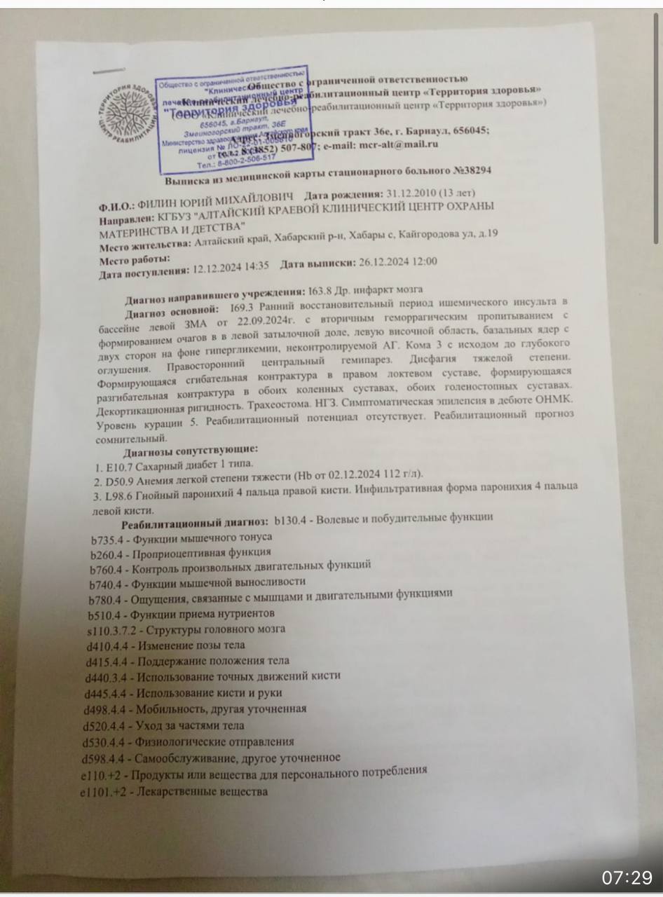 Сейчас состояние пришло в норму, сахар упал и нас перевели в неврологическое отделение. Две недели мы там отлежали, затем нас определили в реабилитационный центр г. Барнаула. Там во время реабилитации у сына была высокая температура, поднималось давление. Две недели мы там отлежались. сейчас мы находимся в городской клинической больнице г.Барнаула №7.